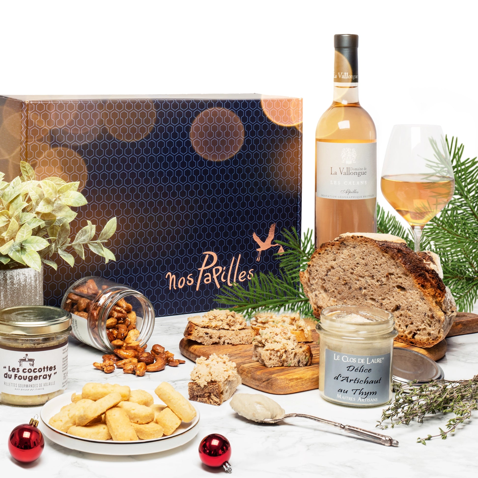 Ces produits proviennent de régions emblématiques du terroir : rosé IGP des Alpilles, rillettes de volailles aux baies de Timur, caviar d’artichauts au thym, sablés au comté AOP et noix de cajou aux épices.
