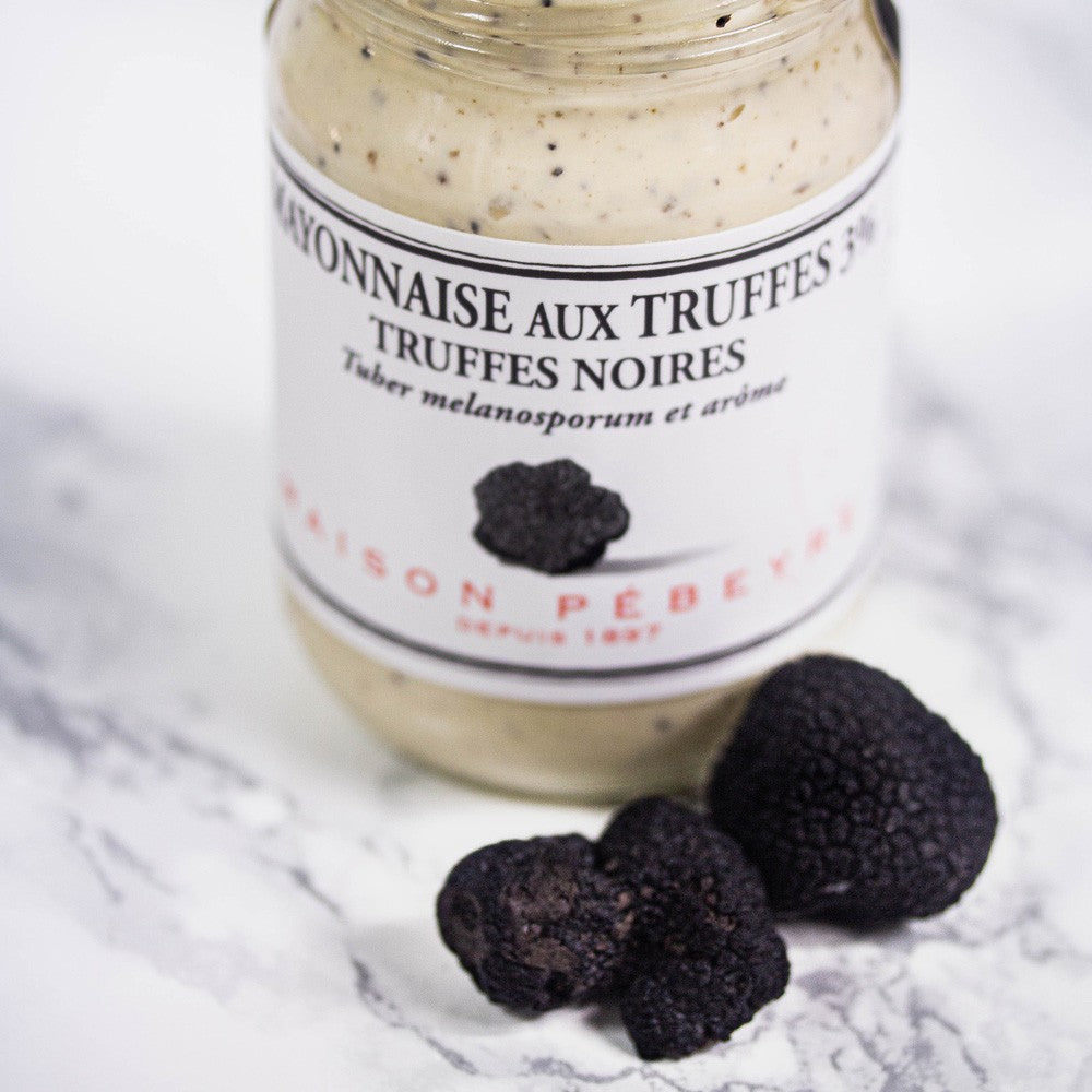 Mayonnaise aux truffes noires 3% (Tuber melanosporum ). S'utilise comme une mayonnaise classique (viandes, poissons, crudités...), son petit truc en plus c'est qu'elle est à la truffe !