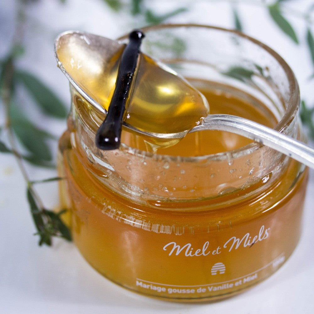 Succombez au voluptueux mariage d'une gousse de vanille aux notes fiévreuses et enivrantes, instillant religieusement ses arômes au cœur d'un miel suave et délicat.
