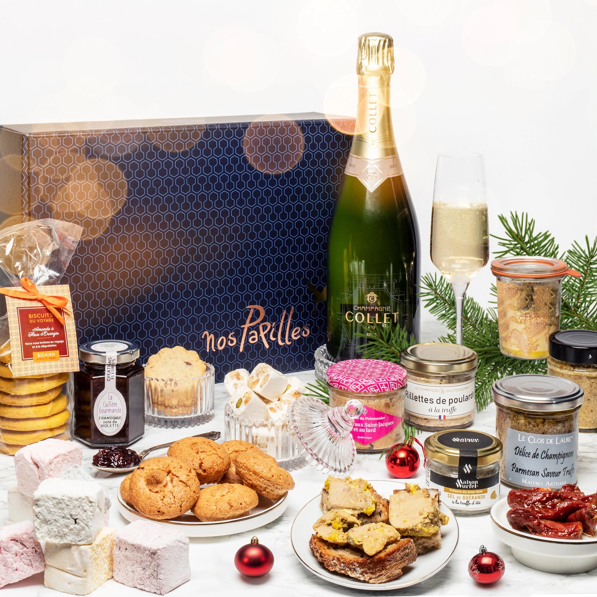 Conçu pour marquer les grandes occasions, ce panier gourmet est une invitation à la célébration. Il associe l’élégance d’un champagne brut Collet à la richesse de produits salés et sucrés d’exception.